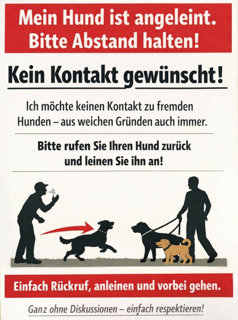 Also bitte: wenn ein angeleinter Hund entgegen kommt, ruft Eure Hunde zurück, leint sie an, nehmt erstmal mit dem Menschen Kontakt auf. Vielleicht ergibt sich dann ein nettes Gespräch, vielleicht dürfen die Hunde dann auch mal gemeinsam laufen. Aber in jedem Fall vermeidet man so Krawall, Ärger und vor allem Unfälle.